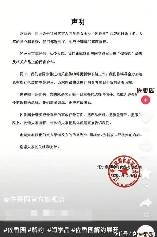 1月11号的时候,佐香园扛不住压力,与闫学晶解约了。