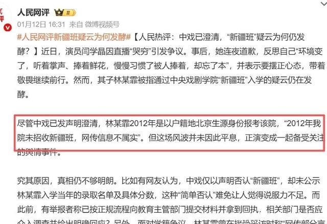 尽管中戏已经澄清了,说林傲霏当年是普通高考入学,并未就读新疆班。